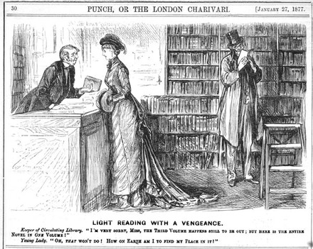 Step forward the hero of the day, the circulating library, through which in exchange for a relatively low monthly or annual subscription, you could borrow the latest titles. It proved a godsend to male readers but even more particularly to women readers like the Bronte sisters who were regular borrowers. Then as now, the concept of a library helped to democratise reading. These libraries not only influenced the form of the novel (they liked the three volume novel because it meant they could loan one volume to three separate readers), they made reading a popular leisure activity, becoming fashionable places in which to be seen. Remarkably, they survived well into the twentieth century when the advert of free public libraries rendered the circulating version redundant.